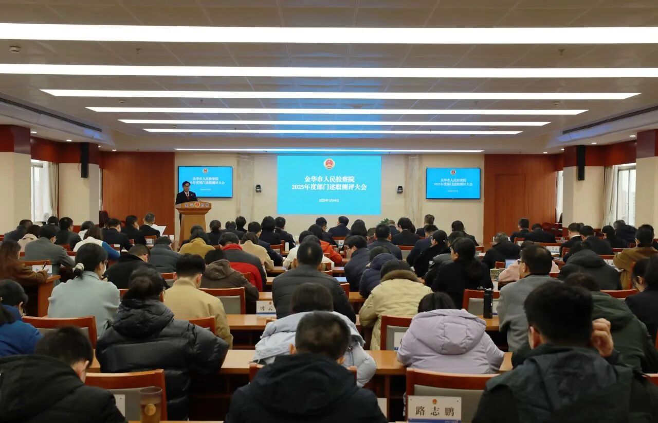 1月19日,金华市人民检察院召开2025年度部门述职评议大会,机关各部门总结汇报2025年工作成效,梳理经验做法,剖析存在的问题和不足,提出2026年重点工作思路举措。市检察院领导班子成员,检委会专职委员及全体干警参加会议。